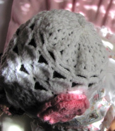 da meine nächste Garnitur noch etwas Zeit benötigt, musste ich zwischendurch mal was Kleines zaubern, eine gehäkelte Frühchenmütze für einen Kopfumfang von 35 bis 37 cm mit kräftig rosa Häkelblüte aus weicher Babywolle, wieder nach meinem eigenen Entwurf.